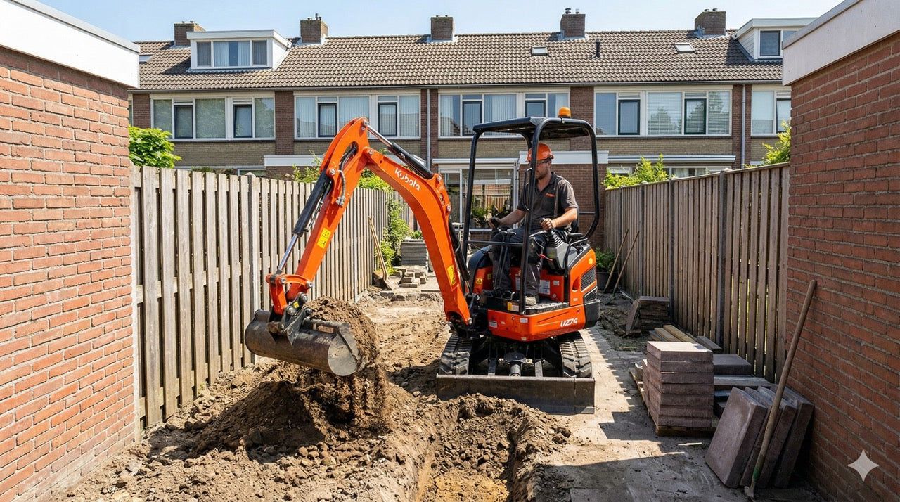 Een tuin afgraven is zwaar en tijdrovend werk wanneer dit handmatig gebeurt. Met een mini graafmachine werken wij efficiënt en gecontroleerd, ook op lastig bereikbare plekken.